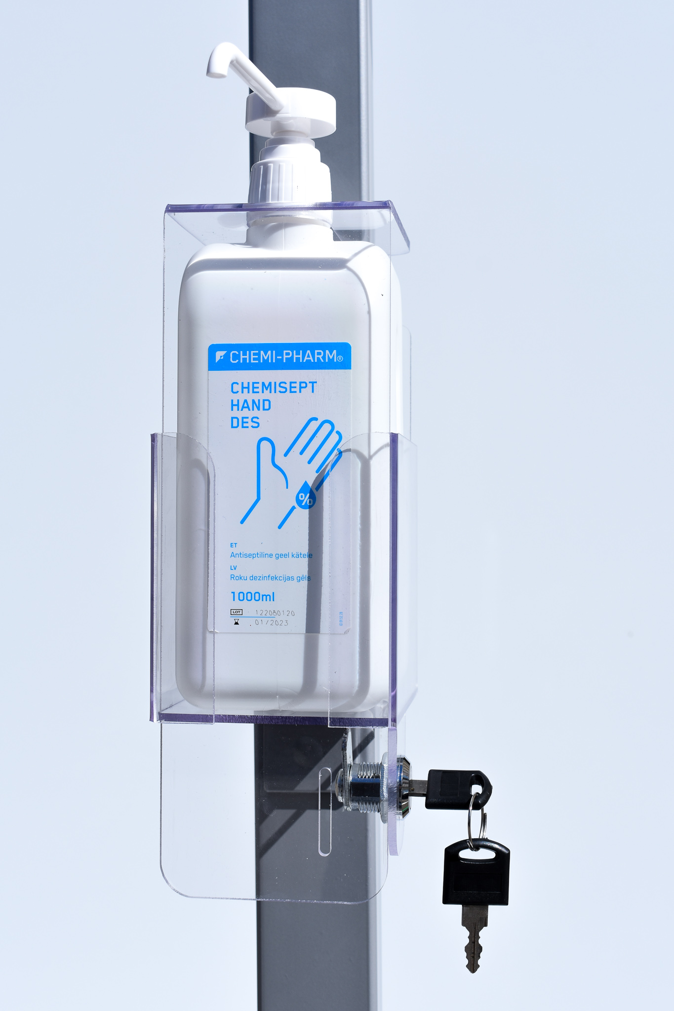 The lockable disinfectant holder is suitable for 0.5 l and 1 l (Chemi-Pharm) bottles. The bottom dimensions for unlocked holder are 100×100 mm, which must be taken into account when choosing the bottle.