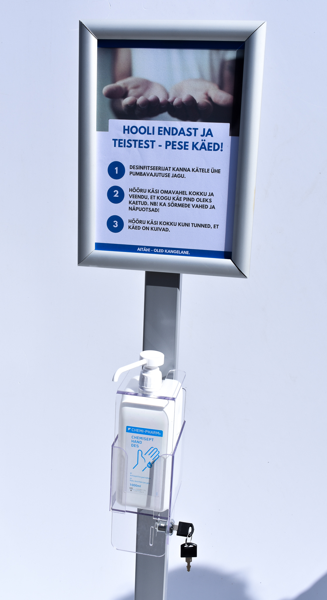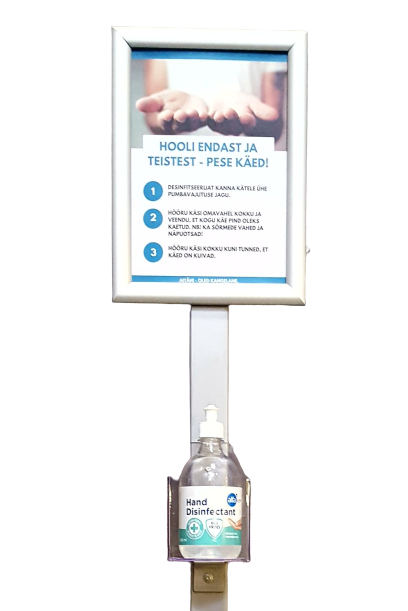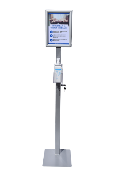Disinfectant holders are equipped with an A4 information board and the support is provided by a post with a 300 × 300 mm metal foot. The finish is resistant to various chemicals and can be ordered in different colors if desired. The height of the station allows people of all ages to use it comfortably (H 1500-1700 mm).
